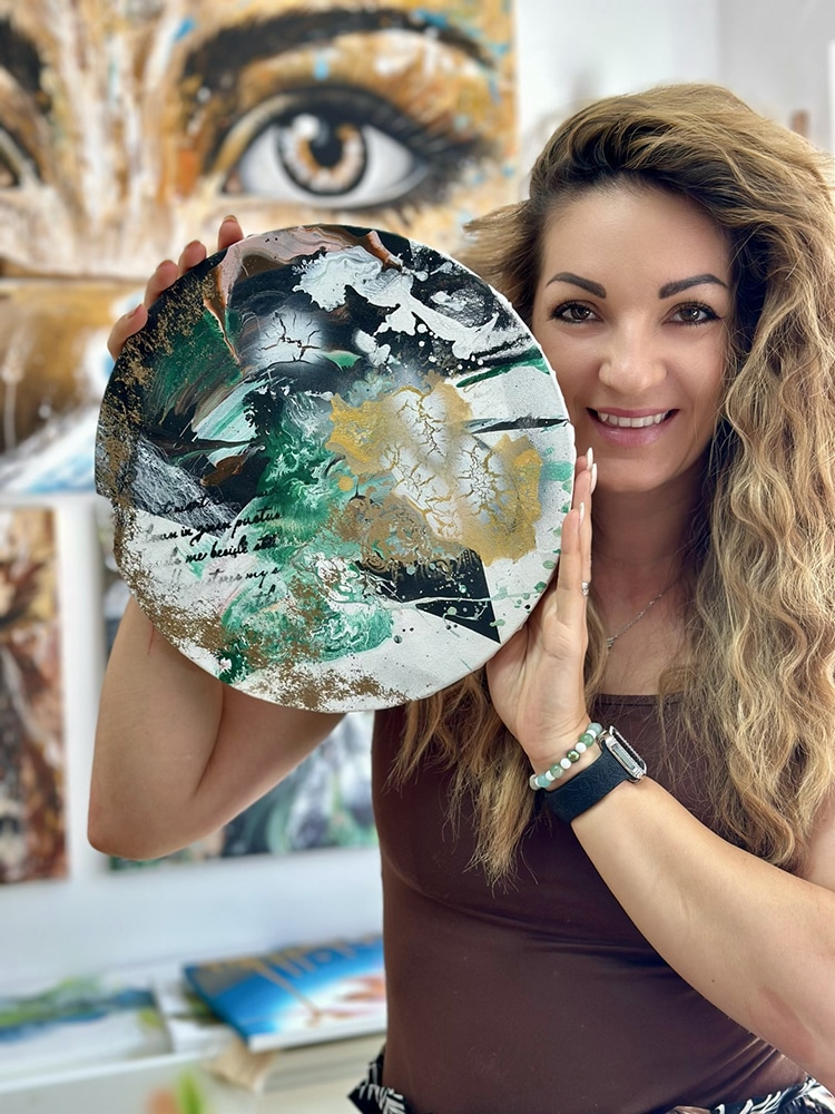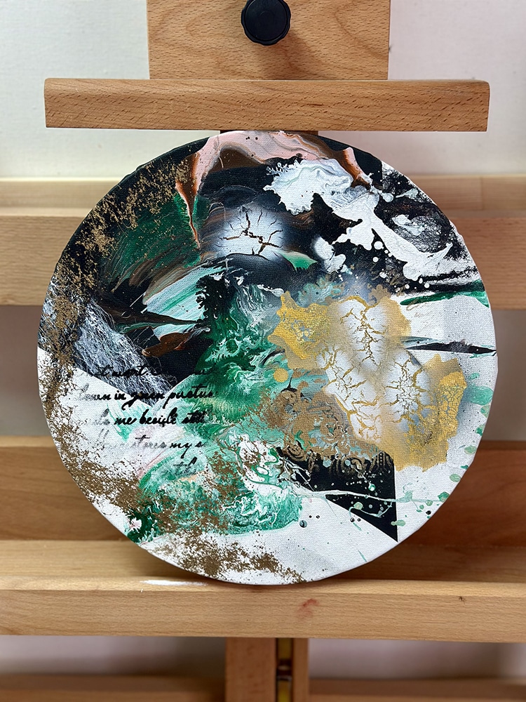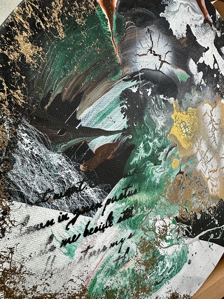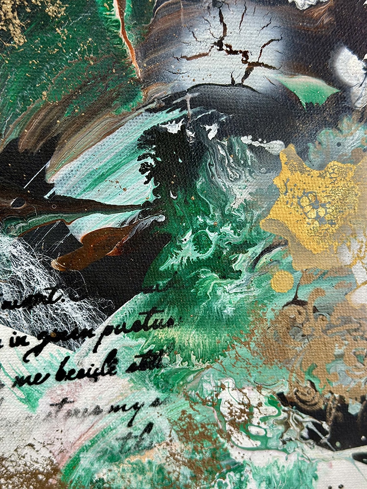 „Pouto“ je vyjádřením spojení, které nelze přerušit. Zelené proudy nesou sílu přírody, zlaté odlesky připomínají okamžiky, kdy světlo proniká do hlubin, a jemné praskliny symbolizují, že krása vzniká i v nedokonalosti. Obraz vyzařuje harmonii a připomíná, že pouto s přírodou i sebou samým je základem naší rovnováhy.