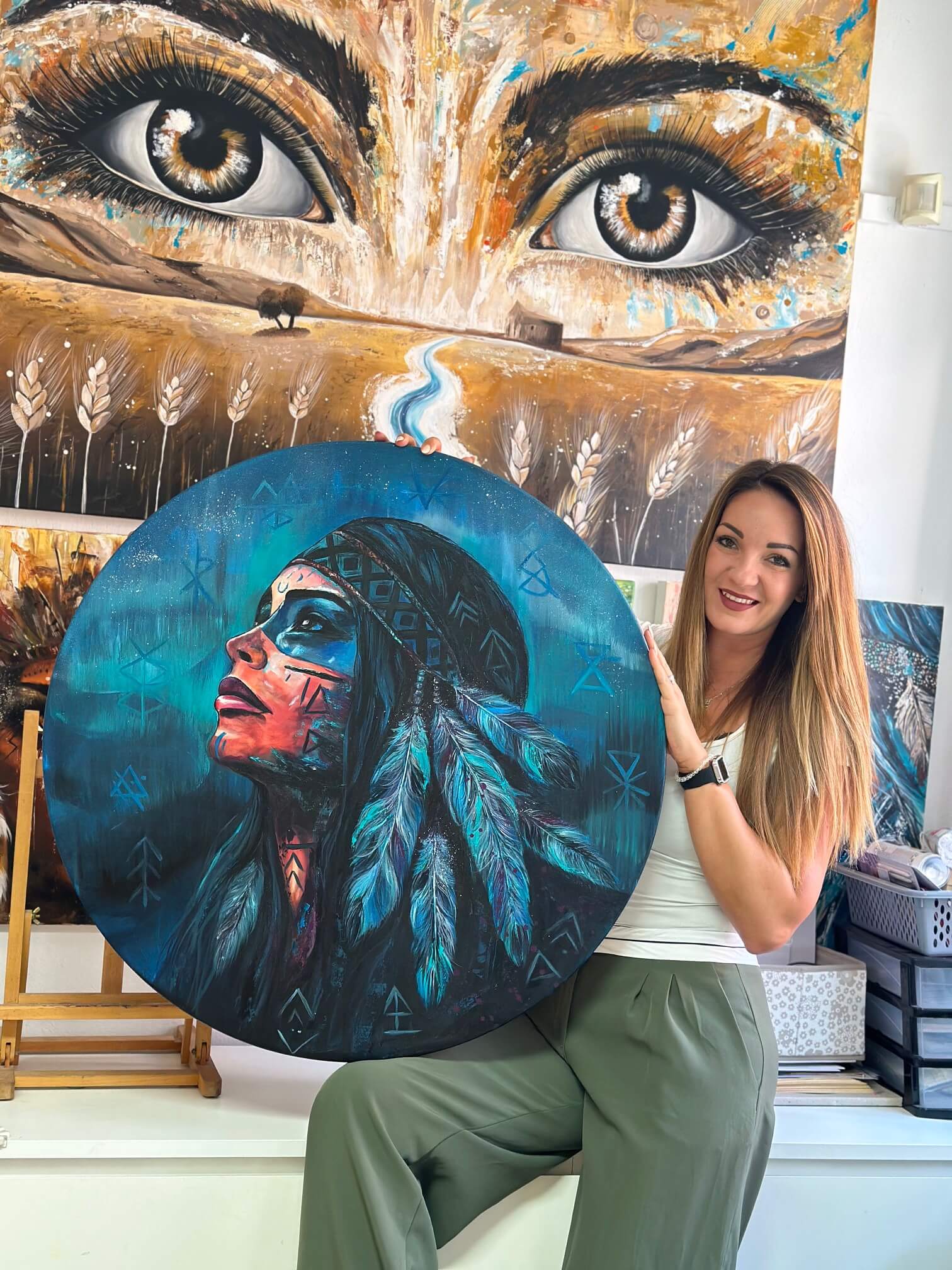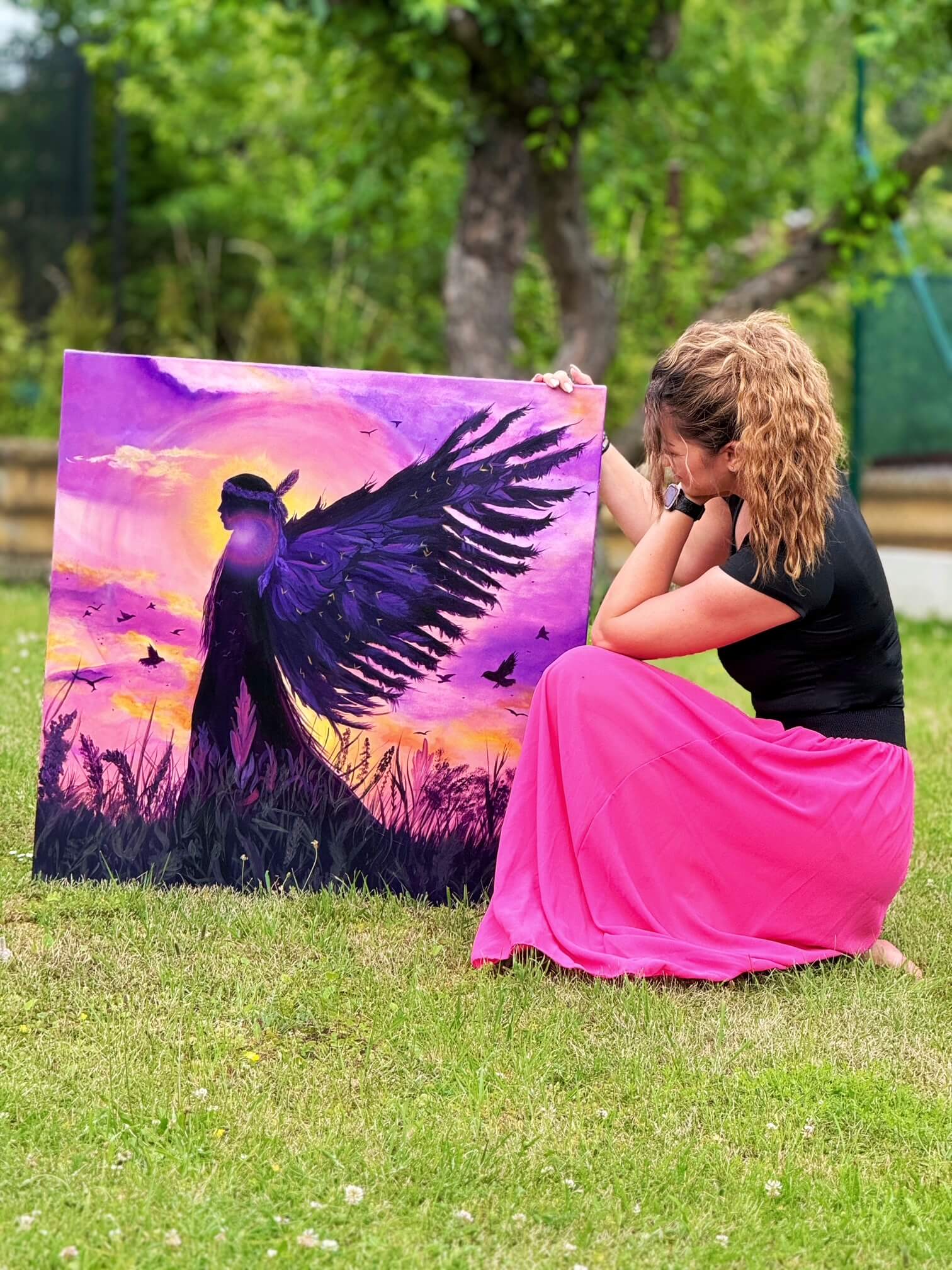 Vznikl obraz „andělský indián“ jménem Angeliánka, který nesl úplně jinou energii. Malovala jsem ho na podporu jedné úžasné holky. Do obrazu jsem tentokrát vložila víc jemnosti, světla a naděje.